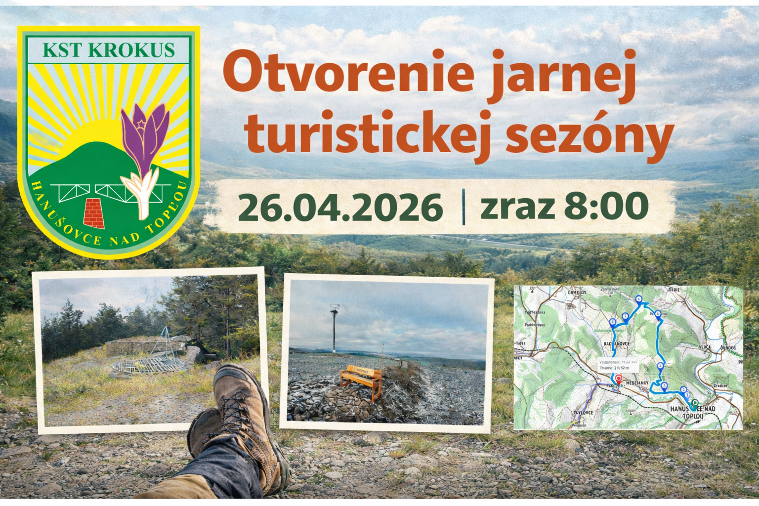 KST Krokus Hanušovce nad Topľou, pozýva všetkých svojich členov, všetkých priateľov prírody či nadšencov turistiky na OTVORENIE JARNEJ TURISTICKEJ SEZÓNY. Dátum: 26.04.2026 (nedeľa) Zraz: 08:00 hod v Hanušovciach n/T na parkovisku pred COOP Jednota. Trasa: Hanušovce n/T – Medziansky hrádok – Veľká Hora – Radvanovské skalky – hrádok Varačka – Radvanovce – Podlipníky, lietadlo. (prípadne Hanušovce